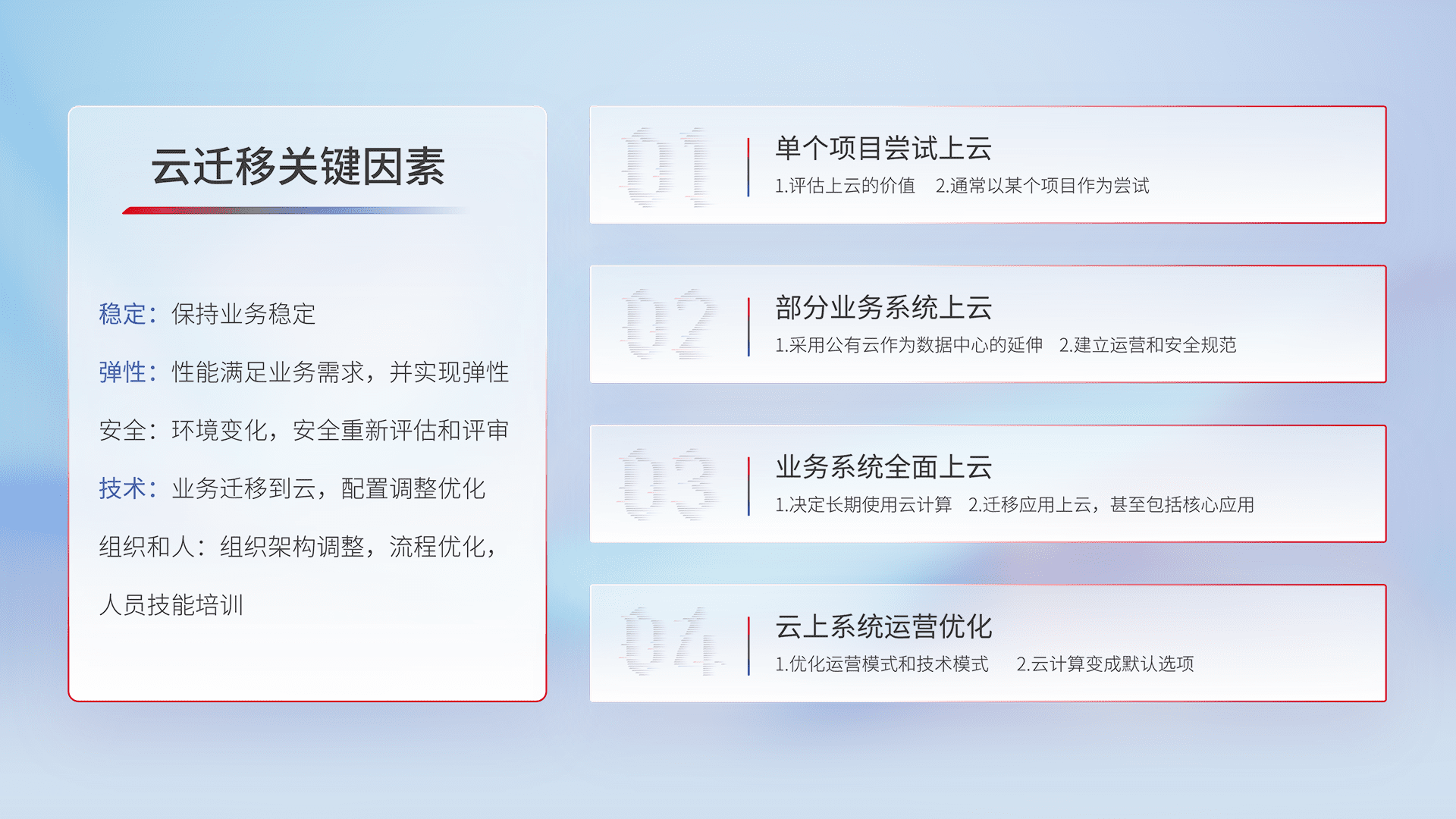 结合实际业务,,,从规划设计、、、云平台选型、、云原生改造、、、、数据迁移、、集成交付,,,迁移全过程为客户识别最佳上云路径,,做好风险识别管理,,设计网络架构、、、身份权限、、、、安全审计合规、、、操作审计、、、、日志审计、、、、监控告警策略、、、多站点容灾设计等,,,,对云上基础设施进行整体规划,,提升IT治理水平,,,以满足弹性、、、高可用、、、高性能的需求。。